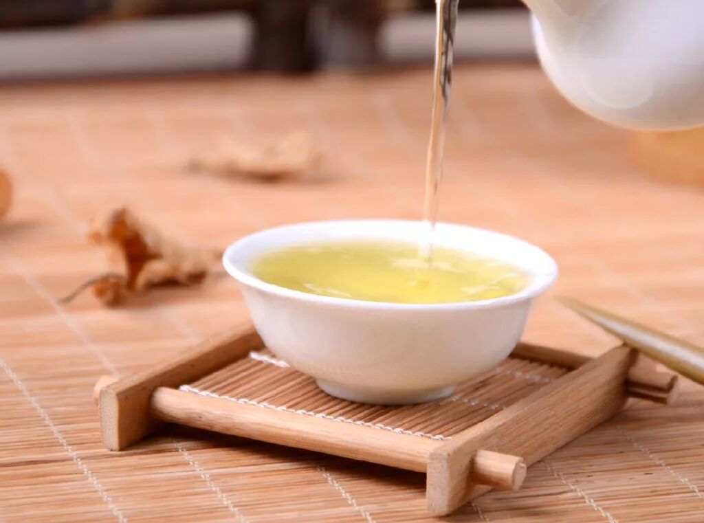 制作方法:取2克生姜洗净,切片,放入沙锅中,倒入约800克清水后置火上,小火煎至锅中的汤汁剩下500克;将6克绿茶、2克盐倒入大杯中,冲入煎好的汤汁,盖上杯盖闷10~15分钟,揭盖,凉至温热饮用即可。