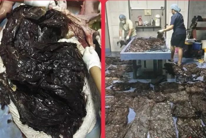 2018年6月,一头领航鲸在泰国南部海域搁浅,后来解剖发现,它的胃里有80多个塑料袋,重约8公斤,铺满了整个实验室。