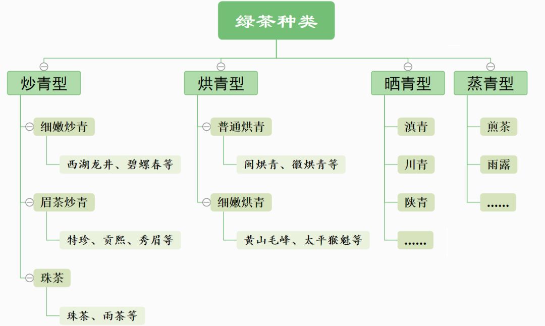 绿茶根据其制作工艺的不同,主要分成炒青型、烘青型、晒青型、蒸青型四个大类,根据其形态、或产地等因素,再细分为各个品类的绿茶,比如西湖龙井、黄山毛峰、太平猴魁等我们耳熟能详的知名茶。同时,在存储绿茶的过程中,要避免潮湿、高温、阳光和以异味,密封保存。