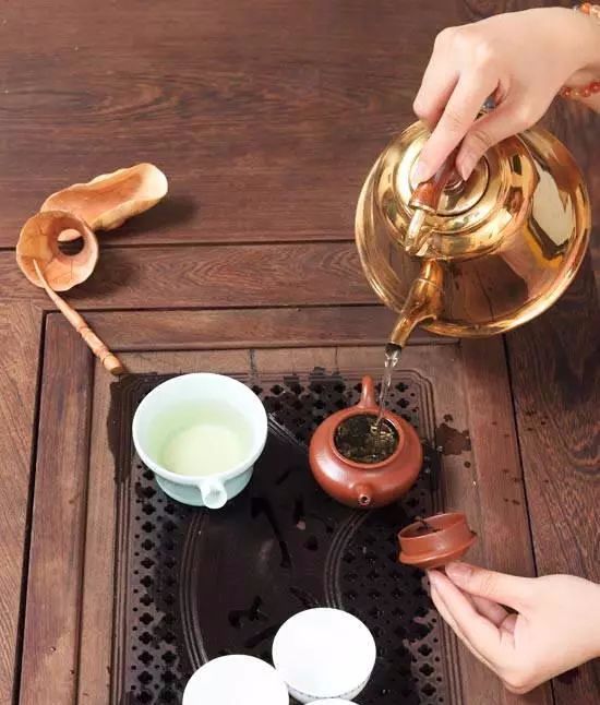 把沸水再次倒入壶中,倒水过程中壶嘴“点头”三次,别一次把壶倒满,茶道的程序其实也只是好看而已,只有这步才是平时大家常用的,表演上有即所谓“凤凰三点头”,向客人示敬。
