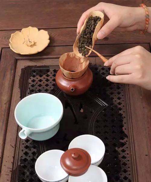 把茶叶放到器具里,也就是放茶过程到茶壶里,名字叫的好听,程序简单,表演可以适当加入花式,更具有茶韵。