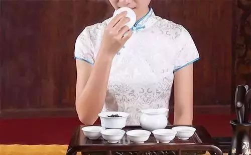 这个是客人开始独自感悟的步骤,客人将茶汤倒入品茶杯,轻嗅闻香杯中的余香,最好能有陶醉状,表示对主人茶的欣赏和赞叹。
