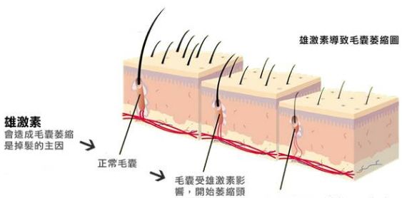 男性秃头大多数情况下是受到睾酮分解物二氧睾酮(DHT)影响,也就是所谓的“雄性激素脱发”,而DHT的生成则是因为睾酮与5α-还原酶的反应作用,容易脱发“秃”的男性携带了对雄激素异常敏感的基因,头发容易受到DHT影响造成脱发。