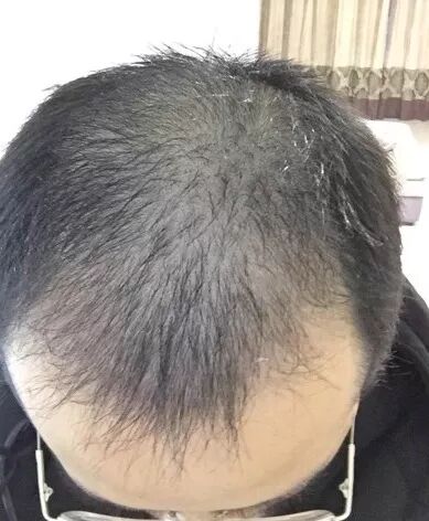 这位发友是典型的雄脱,头顶前半部只剩细软头发,不过由此可以得知,毛囊还有生命力,还可以使用药物,因此推荐了米诺地尔。