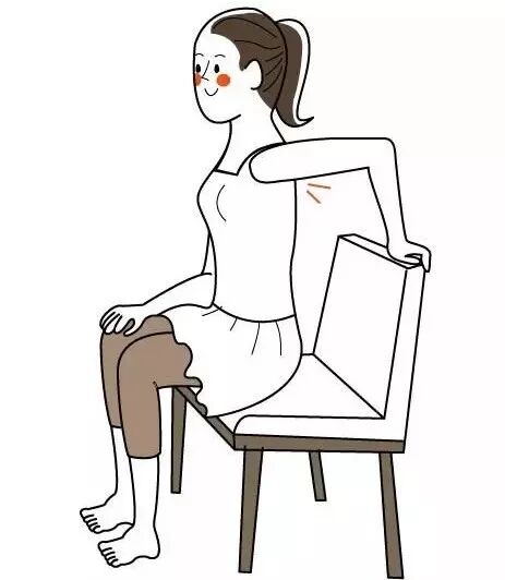 身体面向正面,手往后抓住椅背,手肘弯曲呈直角。