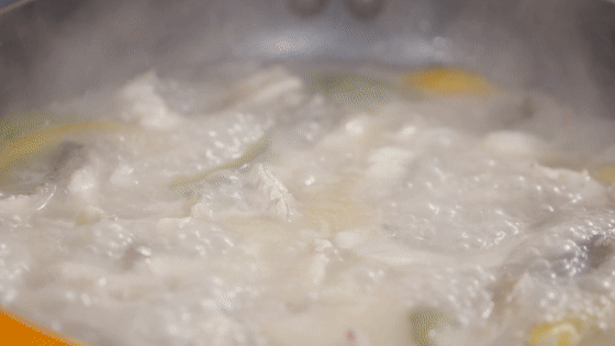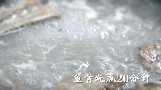 5、煎鱼头、鱼尾、鱼骨,倒入清水,炖煮至汤呈乳白色。