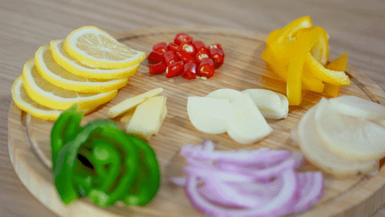 4、半个洋葱切丝,两个酸萝卜切片,三个辣椒(黄色 绿色)切丝,半个柠檬切片,三瓣蒜切片,姜切片,3个小红椒切小段。