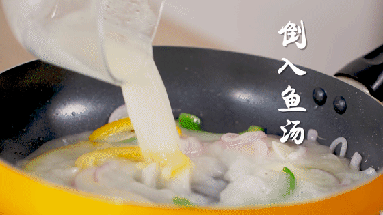 7、将鱼肉倒入翻炒,加入熬好的鱼骨汤。