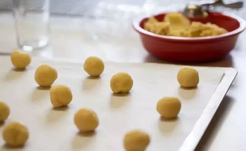 2、将柠檬汁倒入面团中混合,分成很多个小面团。