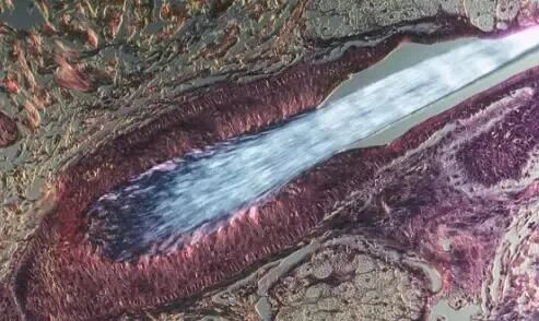 毛囊生长头发,由于毛囊周边细胞组织压力,毛囊从发根处向内挤压,紧紧包裹头发,生长头发,向上顶出。正常生长情况下,毛囊由于内部有发根的缘故,是撑开的。