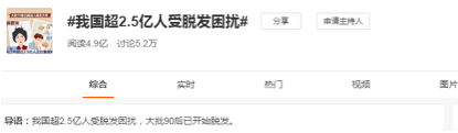 该话题更是在微博上产生热议,截止到昨天已经有4.7亿的阅读,5.1万的讨论量,网友们纷纷表示自己就是脱发大军的一员,并分享自己的治脱经历。