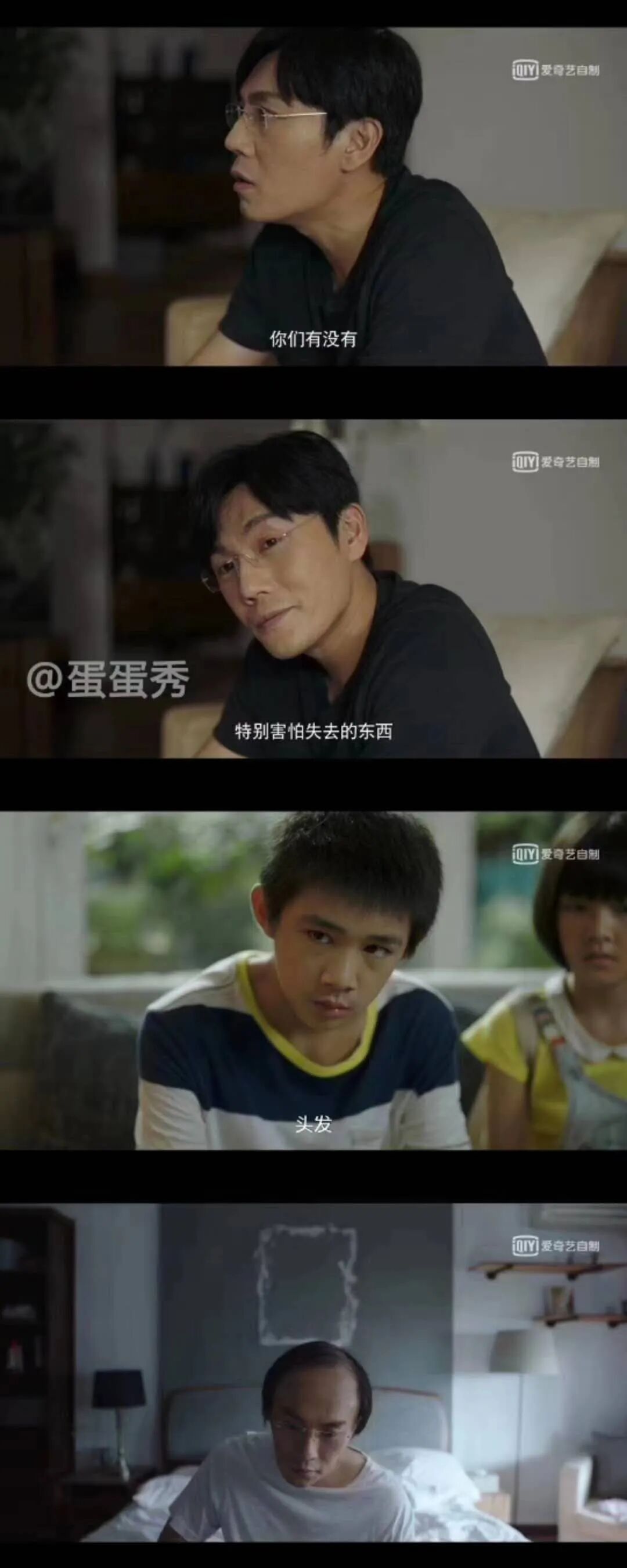 剧集里,张东升洗澡时拿下来的假发片