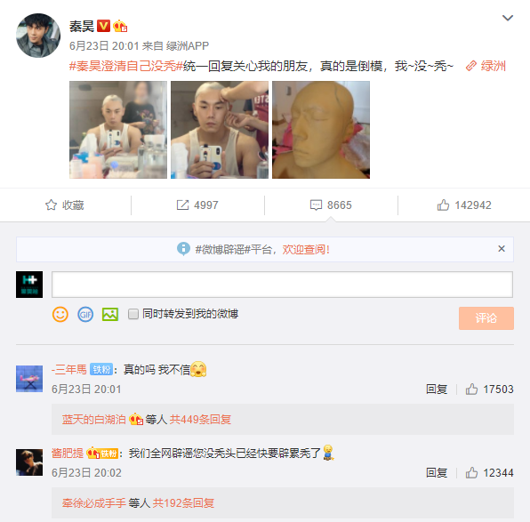 “张东升”的秃顶,迅速成为社会焦点。章子怡给“张东升”的主演秦昊评论“万幸,那时的你还没有秃顶”。评论迅速登上热搜,逼得秦昊本尊出面回应“我没秃”。