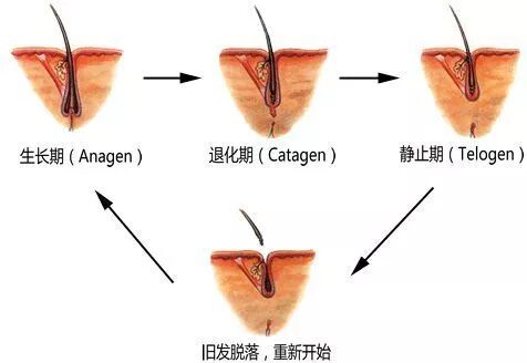 毛发的生长周期一般分为3个阶段,即生 长期、退行期和休止期。各毛囊独立进行周期性变化,即使临近的毛囊也并不处于同一生长周期。