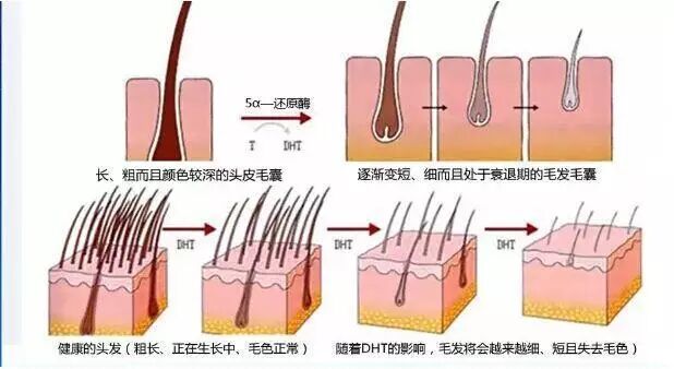 当睾酮被5α-还原酶的酶催化成DHT后,与雄激素受体的结合活性更可提高5倍以上,从而毛囊受到攻击,导致大量脱发。