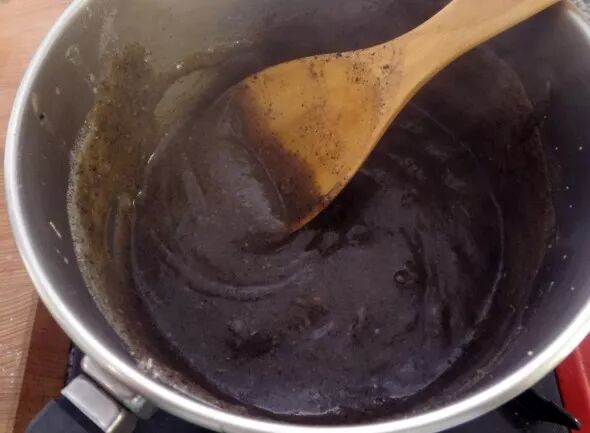 将捣好的芝麻粉和炒熟的糯米粉混合加入热水在锅中搅匀,可以根据自身情况选择少糖还是多糖。