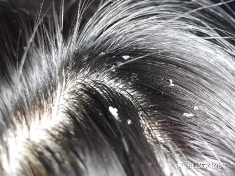 2、头皮上出现较多灰白色糠秕样和油腻性鳞屑;