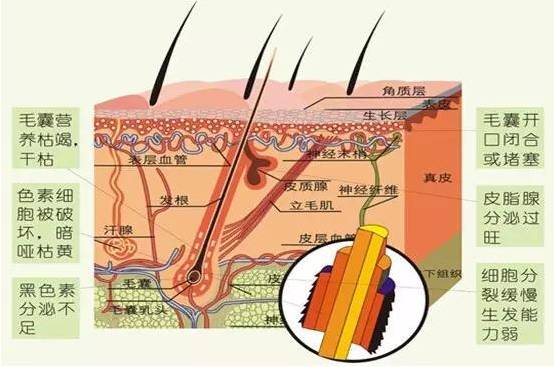 影响毛囊健康的原因有很多,头皮分泌物过多,皮肤病、营养不良、化学药水等等都会直接影响或间接地毛囊的生命力。