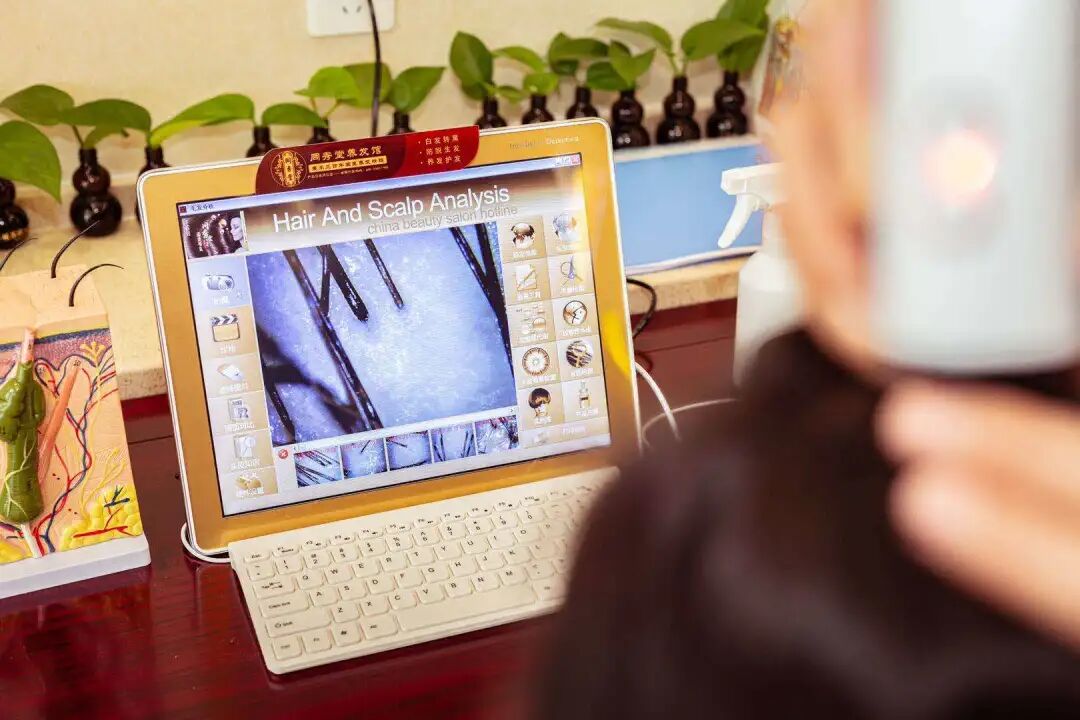 开始检测时,检测医生会将电子显微放大设备对准头皮的每个位置,然后通过与设备相连的电脑呈现出头皮的放大图像。