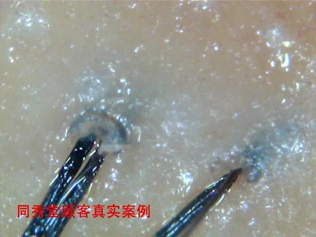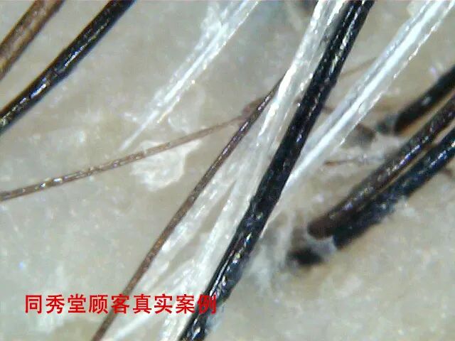 干性头皮一般呈现为灰白色,通过电子显微设备放大,可以看到有细小的头皮屑。
