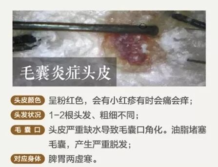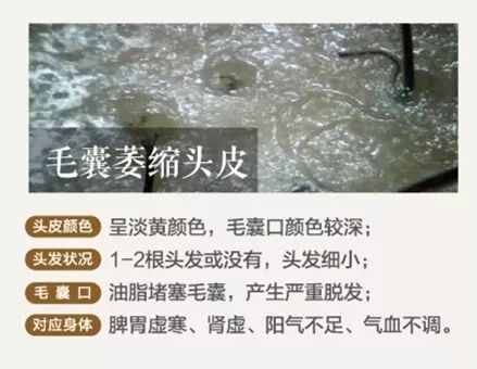 头皮淡黄色且毛囊口颜色较深,油脂、硅油等头皮堆积物堵塞毛囊,头发营养不能正常供应,久而久之毛囊萎缩死亡,产生严重掉发。“发为血之余、肾之华”,此种头皮对应身体阳气不足,脾胃虚寒,肾虚以及气血不调。