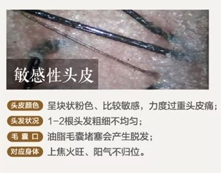 皮肤敏感的人头皮也会有类似情况,有时候会和干性头皮混淆,经常会觉得头皮发痒、头屑多,尤其在更换洗护产品时,头皮问题更是大爆发;而且,对于敏感性头皮者来说,染烫发是一种负担,毛囊孔会遭到严重的破坏。这类人上焦火旺、火不归元,阳气不归位。