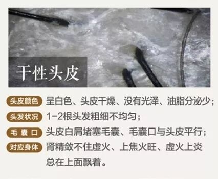 发质看起来干枯脆弱,最常见的是头上易有细小的头皮屑,而且头皮经常会有紧绷感和痛痒感,一旦使用清洁度强的洗发水,头皮可能会恶化成脂溢性干性头皮炎,不但发质受损,还会引起脱发。根源在于肾阴虚导致的虚火上炎,上焦火旺。