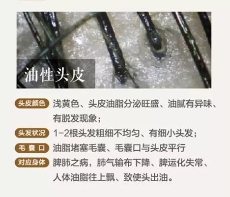 这种头皮最直观的表现就是头发爱出油,就算每天清洗,头发也会油腻,有粘糊糊的感觉,长此以往分泌出的油脂会堵塞头皮毛孔,使有害细菌大量滋生,严重破坏头皮生态平衡。油性头皮暗示脾肺出了问题,肺气不足,脾运化时常,人体油脂上飘导致出油。