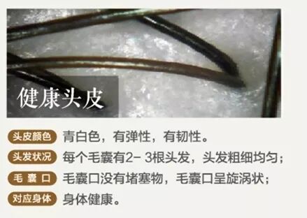 标准的健康头皮。无肉眼可见头皮屑,头皮放松不紧绷,无瘙痒。由于头部血液循环好,还会呈现出能看到毛孔般透亮头皮的感觉。此外头发滋润有光泽、不油腻、不分叉、发根坚固。