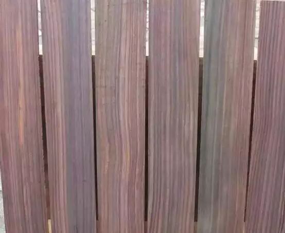 心材多紫褐色、紫红色,少量黄色、黑色或紫色条纹、墨绿色条纹;原木砍伐后,端头如未及时封蜡,常温下会由两端向内颜色变深;木材在阳光下暴晒,颜色可变淡。