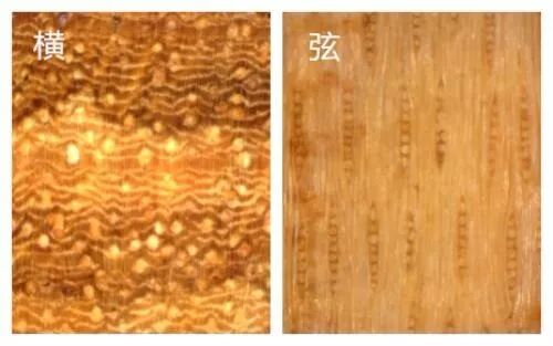 管孔内含黑色或褐色树胶,黑色树胶在紫色条纹里,褐色树胶在较浅的条纹里。管孔含二氧化硅,阳光下发光。在径切面的管槽内亮光一条线。整个板面在放大镜下亮晶晶。轴向薄壁组织很丰富,阳光下肉眼微微可见,放大镜下明晰,主为弯弯曲曲窄带状及细线状,还有傍管带状。木射线放大镜下明显,几乎等宽不等距,波痕可见,可是没有非洲紫檀那么规范。