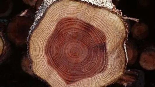 宏观特征:显心材,边材淡黄白色,胸径宽度1.2~1.5cm;心材紫褐或深红褐色,肉眼下的边心材交界处急变。生长轮略明显,径切面有紫色宽度不等的相间条纹。划痕放大镜下可见。散孔材,有半环孔倾向,管孔有大有小,在生长轮内部的阳光下肉眼可见,小管孔放大镜下明显。散生,数量甚少或略少。单管孔为主,也有复管孔2~4个径向列。