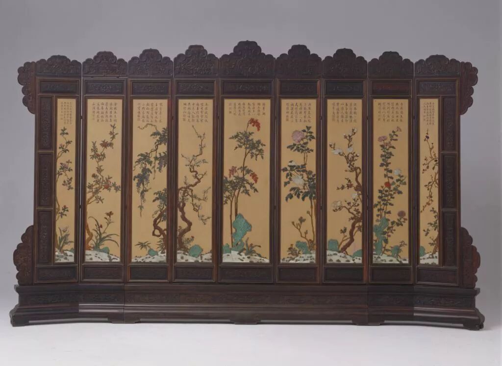 紫檀边座嵌玉石花卉宝座屏风,清乾隆