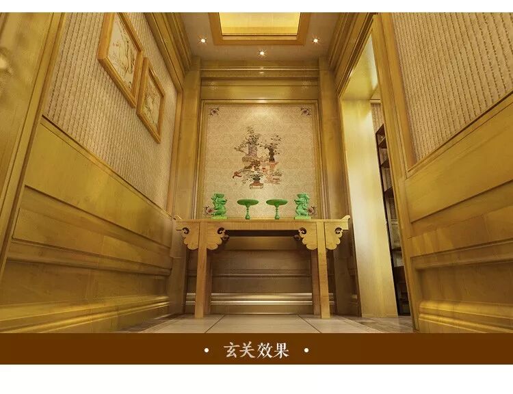 玄关是客厅与出、入口处的缓冲,而这里也是居家给人“第一印象”的制造点。不仅符合风水气场的对称性,山水画镶嵌在镂空花阁里,毫无违和感。