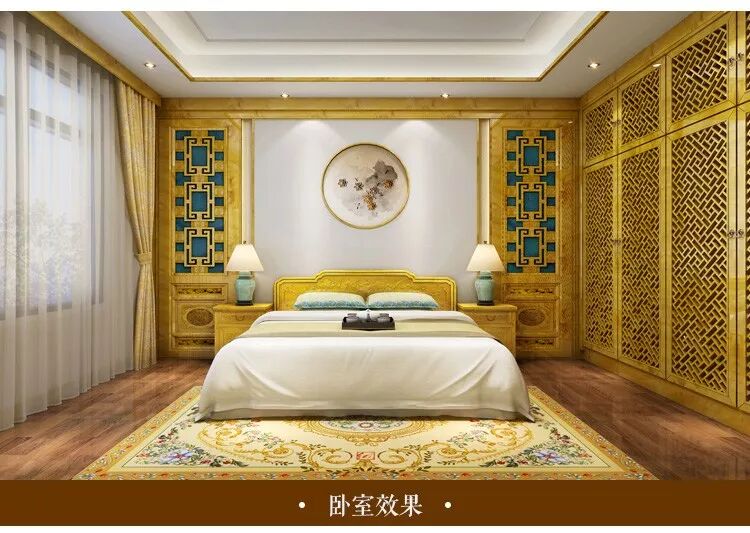 都说卧室要简洁明了,看到这效果,却没有累赘感,反而多出一份温馨之意,在无形中咱老百姓也可以在家中就体验了皇家御用木金丝楠所带来的尊贵感。奢华的吊顶将整个房间笼罩在内,显得娇小,又仿佛在体验着民族风的居住。