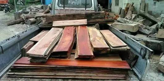 新开的料有酸香味,木色普遍比大红酸枝(交趾黄檀)要浅,有黒筋,但黒筋一般较细,没有大红酸枝的粗。