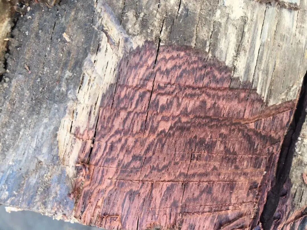 而在原木的时候,黄花梨和仿冒木材还是比较容易检验和区分的,气味、纹理、底色、管孔、密度、硬度,包括裂纹都可以作为鉴别的指标,总有几项不同之处