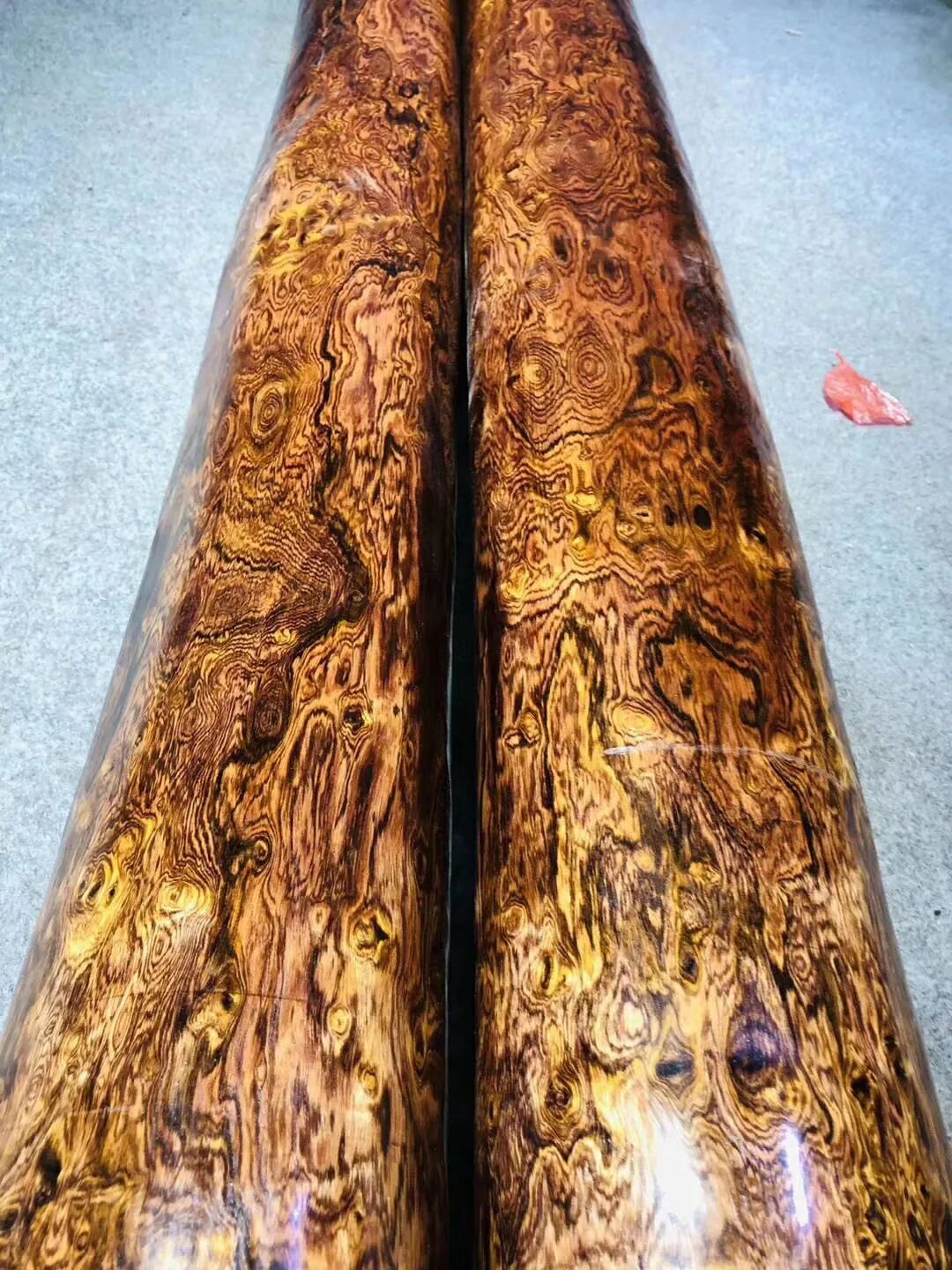 另外,黄花梨虽然以纹理著称,但通常来说,径级越小的黄花梨,越常有复杂丰富的纹理,大径级的黄花梨,纹理反而大多比较平素。口径特别大、料形特别直,同时纹理特别炫丽甚至夸张的黄花梨原木极其罕见,怎么这么轻易就让你给碰上了?