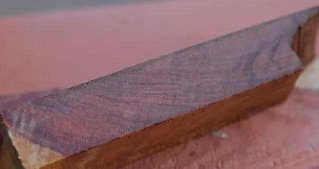 在现实中,缅甸白枝(奥氏黄檀)酸香味很特别,很刺鼻的;老挝的花枝和缅甸的花枝在味道浓淡方面也有出入,但香型却是一致的,酸味中有冲鼻子的不舒服感觉;大红酸枝因产地不同,在香味的浓淡方面差别也不小(一般北部料比较淡,南部料比较浓),但的的确确是同一种香型,就是那种酷似优质老陈醋的高雅酸香味。因此,只要发现是红酸枝料,砍削一点心材来闻味道,的确很容易识别是不是交趾黄檀的。