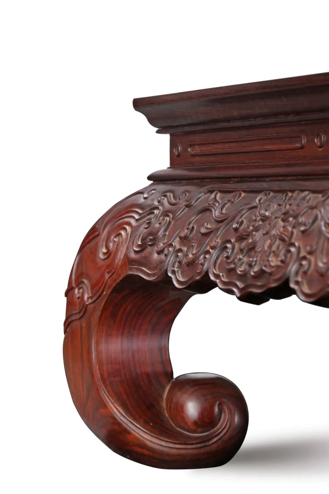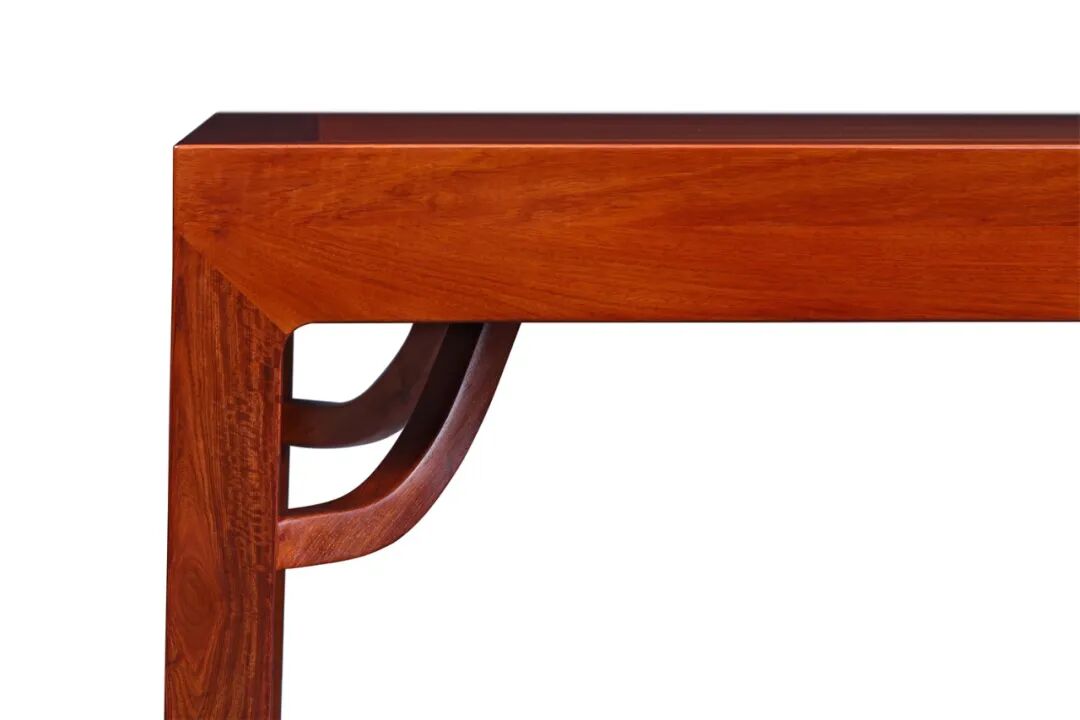除了博古架,像一些出名的家具构件,如霸王枨也可作弯弧线条之状,霸王枨虽其名霸气,但实质为连接腿足与家具面的一种构件,形象接近于霸王举鼎的手臂,故得“霸王枨”之名,圆弧形的霸王枨与方直有序的画桌类家具结合,使得硬朗至于又不失柔和之态,颇有文人意趣。
