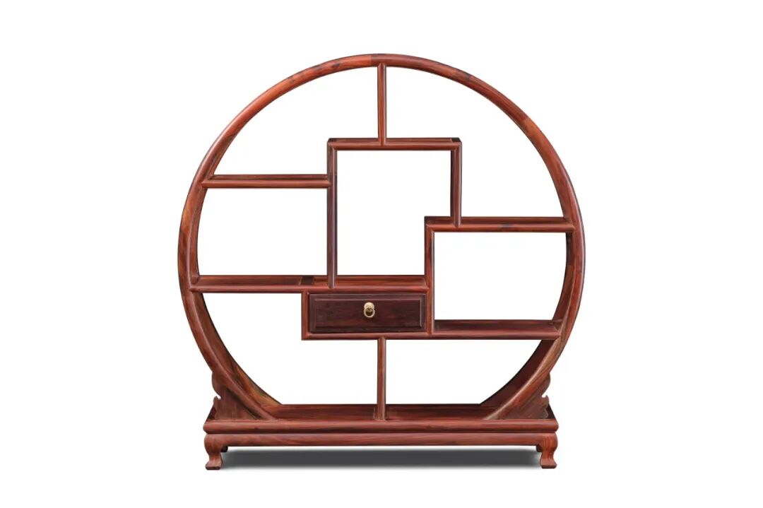 博古架因大小不一,高低交错的宝格而闻名,其格局以及器型就有些洒脱不定方圆的意味,而这圆弧框架中设以大小不一的宝格自然是正常的,图中的博古架亦是如此,整个宝格框架采用圆形弯材,使之整体看上去有圆融之意象。