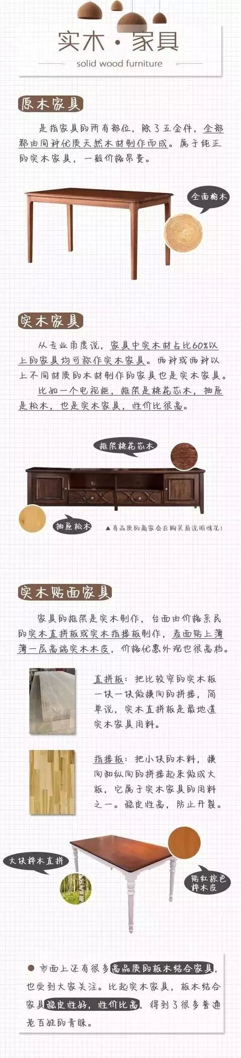 4、纯实木家具。主材(框架、面板、芯板)、辅材(背板、抽屉、隔板)均采用实木,主材为统一材质,无夹板和贴皮的为纯实木家具。