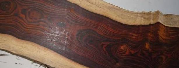 特征:心材多紫褐色、紫红色,少量黄色、黑色或紫色条纹、墨绿色条纹;原木砍伐后,端头如未及时封蜡,常温下会由两端向内颜色变深,木材在阳光下暴晒,颜色可变淡。