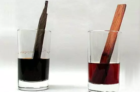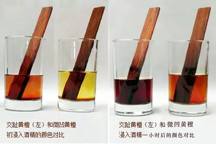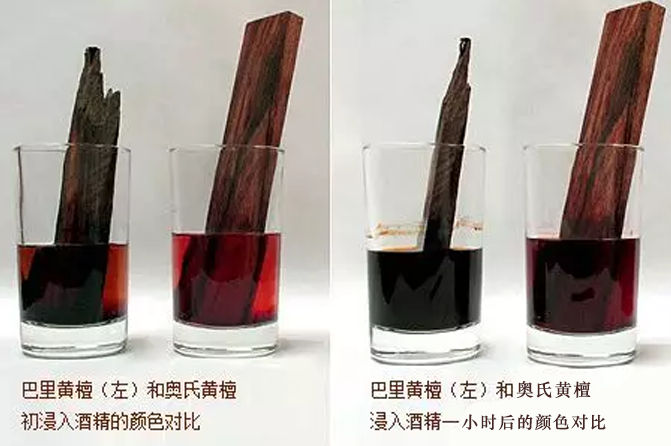 对两者进行酒精浸泡测试可见,交趾黄檀的酒精溶液呈橘红色,而巴里黄檀呈紫褐色至黑褐色,相比外观,这种化学反应上的变化可称得上这两种木材最为明显的区别。