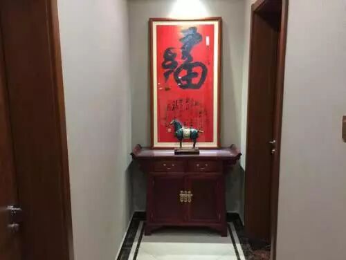 走廊的地面铺贴了两圈波打线,不仅漂亮还对空间进行了区域的划分,尽头的地板摆放了一个斗柜,上面摆了衣服超大的福字装饰画,寓意一家人福寿安康。