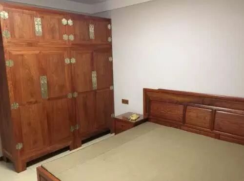 卧室全套红木的中式家具,衣柜上面的金属镶片,也增加了美感与搭配感,更加赏心悦目。