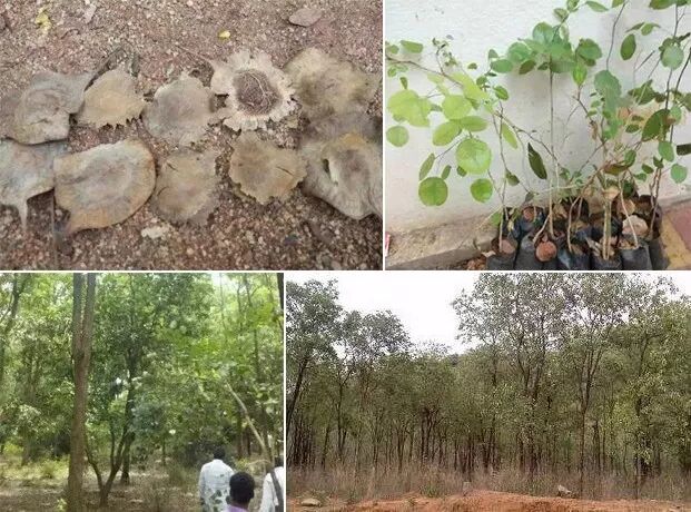 上图:现场收集的小叶紫檀种子,工培育的小叶紫檀树苗,小叶紫檀人工林。