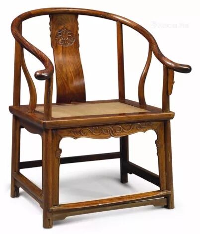 圈椅的行最能体现明式家具的灵韵,最基本的圈椅是素圈椅,注重通体的光滑素雅,椅盘之上为圆木椅圈后背和扶手一顺而下,注重肘部、腹部、臀部的支撑。椅盘之下外圆里方,三面素牙条,暗合天圆地方的传统思想。整体除靠背板上有简单的雕刻,扶手鹅脖之间有晓得角牙之外再无其他的装饰。