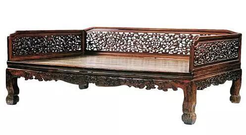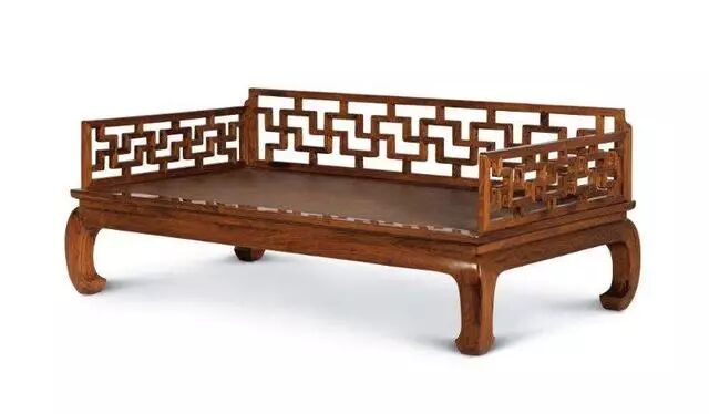 罗汉床的差别主要表现在围子的做法上,最简捷朴质的只有三块光素的整板,正中一块稍高,或有的整板加一些浮雕花纹;另一种是围子四周有边框,中部用短材攒接出各种各样的花纹。