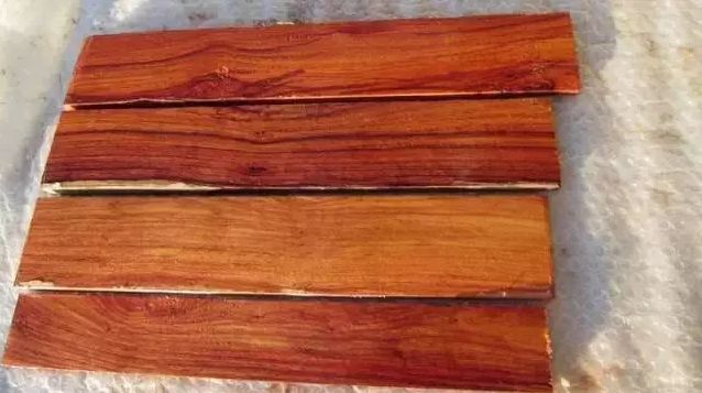 交趾黄檀心材新切面颜色是暗红或紫红色,微凹黄檀是橘红色,特别要注意的是要看新切面,因为微凹黄檀材色久则变深,变深后的颜色与交趾黄檀的颜色非常接近,此时在颜色上时非常难辨别的,这也是微凹黄檀能冒充交趾黄檀的一个原因所在。
